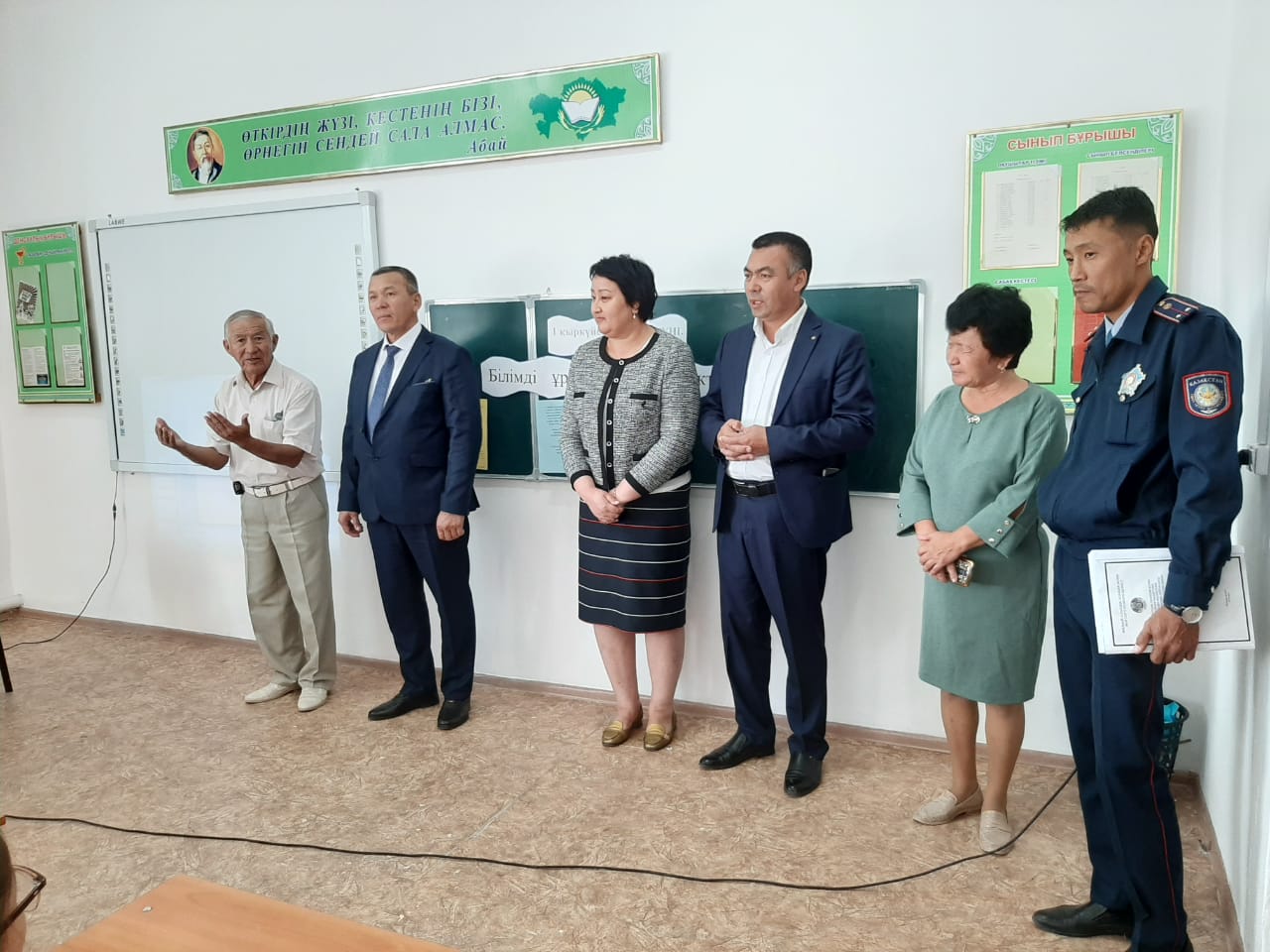 Сөз алған ардагер ұстаз С.Қажығали: алғаш қадам басқалы тұрған бүлдіршіндерді және оқушылар мен ұстаздары жаңа оқу жылдарымен құттықтап, ақ тілегін жеткізді. Сонымен қатар ТЖБ өкілі Орынбасаров Дәурен: балалардың қауіпсіздігін қадағалау және алдын алу мақсатында ата-аналарды хабардар етті.
